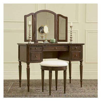 Beautifully styled vanity with tri-fold mirror and round stool is constructed of solid wood and rich cherry veneers. The finish is "Warm Cherry". The dentil molding frame on underside edge of top is accented with five working drawers that rest o... Read more