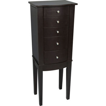 The Sheena is a full-sized java finished armoire featuring 4 generous drawers, a lift top section with ring pad and mirror in the lid. Two discreet side panels with hooks for chains and necklaces will keep them tangle free. The Jewel-Protect... Read more