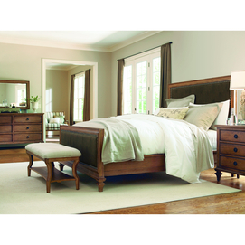 Features stitched bonded leather headboard and footboard and contrasting gimp welt with decorative nail head trim Constructed of white oak solids with oak veneers Distressed cappuccino finish 68 x 90 x 60 Double bolt on rails