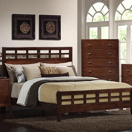 Sleek metro grid style contemporary bedroom suite Solid rubber wood and veneer construction Medium tone brandy brown finish Queen bed has three support slats and one centre leg for extra support King bed has five support slats and one centre leg... Read more