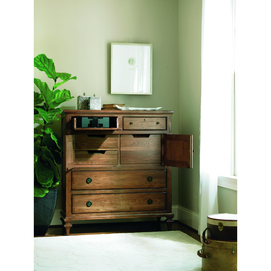 Constructed of white oak solids with oak veneers Distressed cappuccino finish Features english dovetail drawer construction, stained and sealed drawer sides, and wood on wood drawer guides Features 5 drawers, jewelry insert, top left drop dow... Read more