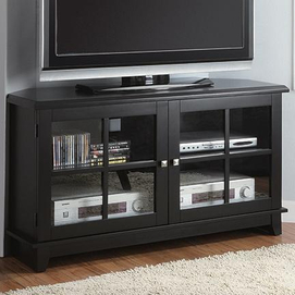 NEW! holds most flat-screen TVs up to 48", maximum 90 lb. tempered glass doors 1 adjustable shelf wire management wood and wood veneers black finish 48" w. x 18" d. x 27" h. assembly required READY-TO-ASSEMBLE. Instructions and toll-fre... Read more