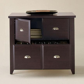 Rich jamocha finish Lower drawer features full extension for letter and legal-size hang files Storage behind 2 doors 34 3/4" w. x 21 6/8" d. x 301/4" h. Sturdy wood product All hardware in nickeltone finish READY-TO-ASSEMBLE. Instructions an... Read more