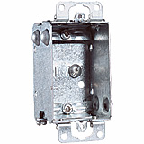 Device box. 3 in. x 2 in. x 1 1/2 in. Made of galvanized steel. Shallow device boxes are mainly used for receptacle installation in end of run or in confined areas such as walls made of 2 x 2 studs. Gangable. Also offered in 3 in. x 2 in. x 2 in.