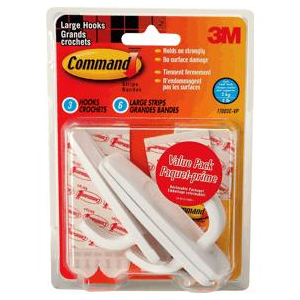 Adhesives Command Large Hooks 3 large hooks with 6 strips Each hook holds 5 lbs Holds on strongly Comes off cleanly No surface damage