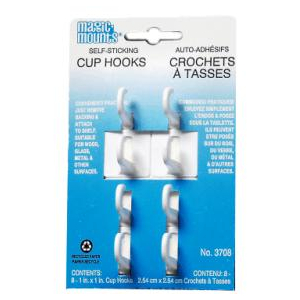 Adhesives Self-Sticking Cup Hooks Convenient practical Just remove backing and attach to shelf Suitable for wood, glass, metal and other surfaces Not recommended for use on wallpaper, plasterboard or unfinished wood 8 per card 1" x 1"