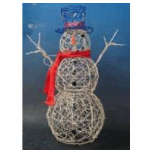 Lighted Frames Grapevine Snowman Sculpture Indoor/outdoor use Knock down construction Coated metal frame Champagne colour 30" lead wire 36" INCLUDES: Spare bulbs Metal stakes 60 LED lights: 8 random twinkle LED's, 52 steady LED's