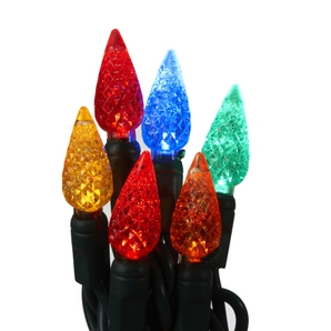 Outdoor, Led - Patented one piece construction Multi 35 LED lights, C6 lense 5 colour multi red/yellow/orange/blue/pure green 4" spacing, lighted length 11.3' Connect up to 180 sets, end to end, green wire Lights are cool to th... Read more
