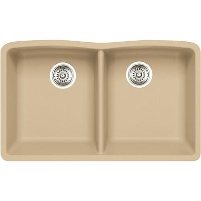 This double bowl undermount sink from BLANCO is made of 80% natural granite. Rear positioned drain holes maximize usable bowl and cabinet storage space. 3-1/2" stainless steel strainers are included. 80% Natural Granite Colour: Biscotti Bow... Read more