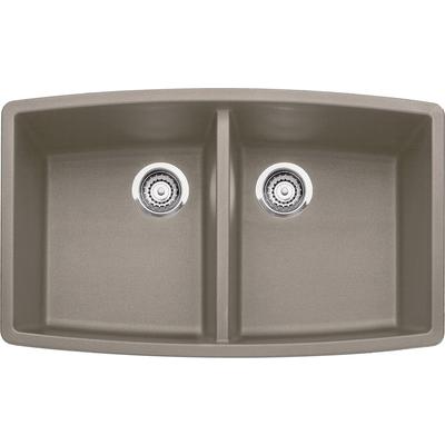 This double bowl undermount sink from BLANCO is made of 80% natural granite. Rear positioned drain holes maximize usable bowl and cabinet storage space. 3-1/2" stainless steel strainers are included. 80% Natural Granite Colour: Truffle Bow... Read more