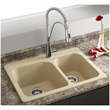 1½ sink. 27.5 in. x 20.75 in. Made of solid silgranite. Rear positioned drain holes maximize usable bowl and under cabinet space. 3.5 (90 mm) stainless steel strainers, template and clips included. Biscotti colour. Limited lifetime warranty.