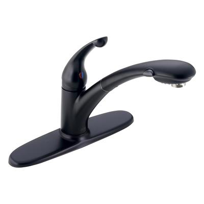 The Delta Signature Single-Handle Pull-Out Sprayer Kitchen Faucet in Matte Black has a low-profile design with sleek lines and subtle curves. These features combine with a black finish to give this faucet a contemporary appearance that ca... Read more