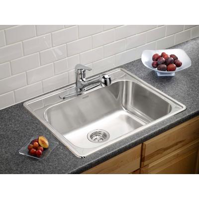 This single bowl drop-in sink in brushed satin finish features 20 gauge stainless steel and 18/8 chrome/nickel content. Tight radius corners help maximize bowl capacity. 3-1/2" stainless steel strainers included. 20 gauge stainless steel Min... Read more