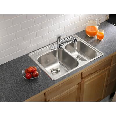 This 1.5 bowl drop-in sink in brushed satin finish features 20 gauge stainless steel and 18/8 chrome/nickel content. Tight radius corners help maximize bowl capacity. 3-1/2" stainless steel strainers included. 20 gauge stainless steel Min. Cabinet... Read more