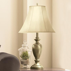 Save 10% when you buy 2 or more Antiqued Brass-finish Table Lamps one trilight bulb uses one 150 watt (max.) trilight bulb; not included metal bell-shaped shades with silk-like taupe fabric 26" h.