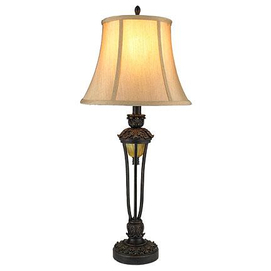Illuminate your room and make a traditional décor statement all at once. This lovely piece is certain stand out as an antique-inspired focal point in any space. Features bell-shaped shade in luxurious silk-like fabric Resin and metal construction... Read more