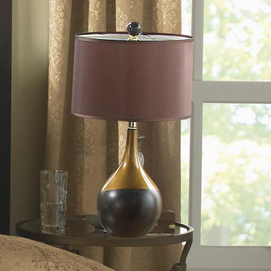 Save 10% when you buy 2 or more Lamps hard-back silk-like fabric shade 19" h. metallic and matte coffee-glazed finish drum-shaped shade hard-back silk-like fabricon-styrene shades trilight switch ball-shaped finial use one 100-watt (max.... Read more