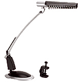 Desk lamp. 25 1/2-in. high. Can be used as a desk, clamp or wall lamp. Fluorescent lighting. Made of plastic. Black. G23 lightbulb included.