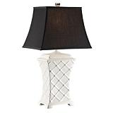 Decorative table lamp with white base and lattice detailing Features flared black fabric shade Dimensions: 14.5 l x 25.5 h x 10" w (37 l x 65 h x 25 cm w) Requires one 100W (max) medium base