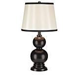 Decorative table lamp with stacked globe base and black finish Features rimless drum fabric shade Dimensions: 13 w x 23" h (31 w x 58 cm) Requires one 100W (max.) medium base