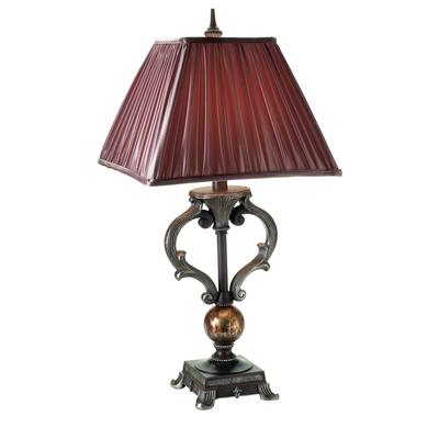Blurring the division of contemporary and traditional, contoured frames are antiqued with a rust finish. Wrapped funnel glassware is mottled authentically for the perfect accent at the base. Simply plug in and use. Champagne fabric shade adds... Read more