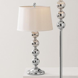 Save 10% when you buy 2 or more 'Geo' Stacked Ball Table Lamps 14" shade 6' cord 27" h. metal construction with a polished chrome finish fabric-on-styrene cone-shaped shade ball finials trilight switches
