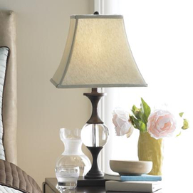 Save 10% when you buy 2 or more lamps from the same 'Peyton' Lamp Collection bronzetone steel base with glass ball 12" square bell-shaped beige homespun shade trilight switch uses 100-watt (max.) trilight bulb,bulb not included 25" high