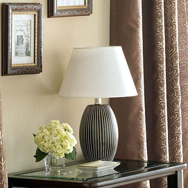 Save 10% when you buy any 2 or more Ceramic Table Lamps ivory-coloured ribbed design cone-shaped shade 18" h. glazed dark coffee finish hard-back fabric-on-styrene shades on/off socketswitch trilight switch use 100-watt (max.) trilight bul... Read more