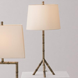 Save 10% when you buy 2 or more 'Bamboo' Metal Table Lamps with tripod legs 13" diam. tapered, drum-shaped shade 24 1/2" h. antiqued brass finish use a trilight bulb fabric-on-styrene shades bulbs not included