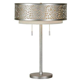Ren-Wil's innovative lighting collection is great for accenting, dramatizing or setting the mood in any room. Beige cotton hard back drum shade and outer shade with laser cut metal pattern, silver finish & light rubbing. metal pole body and bas... Read more