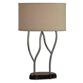 Beige linen oval shade with 1/2'' trim. Satin nickel body in the shape of branches. Resin base in the shape and finish of tree. Clean with soft damp cloth 29''