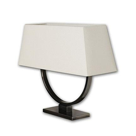 Metal with pewter plating. Linen hard-back European style shade. Tri-light switch 24'' high x 10 width x 7 deep
