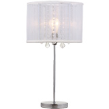 Table lamp. 21 in. high. Made of metal with fabric shade and glass beads hanging. Satin nickel metal base. White. (60-W type A lightbulb not included.)