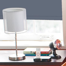 Save 10% when you buy 2 or more Satin Chrome-finish Table Lamps organza shade with white inner hardback shade polished chrome metal on/off pull chain takes 60-watt (max.) medium-base bulb, not included 18" h. some assembly required