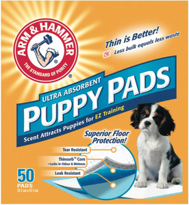 ARM & HAMMER® Puppy Pads provide superior floor protection in an ultra-thin design. Puppies are attracted by a scent to the Puppy Pad for easy training. 3-layer core absorbs up to 50% more than other thicker pads.* *Based on liquid absorbed pe... Read more