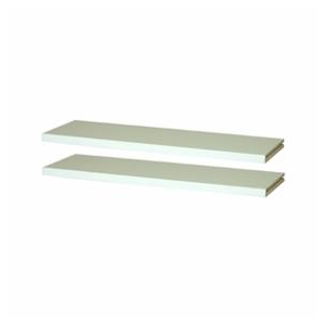 Wood Melamine finish, constructed of 3/4" high density MDF Includes: 2 shelves and mounting hardware Holds 50 lbs. per shelf Use only with shelf kit 21" W x .75" H x 6.75" D White