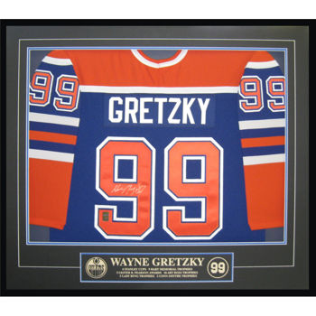 This Wayne Gretzky Oilers replica jersey has been hand signed and comes framed in a black wood with acid free matting with a decorative v-groove and laser etched description. Features: Personally signed by Wayne Gretzky Replica CCM jersey... Read more