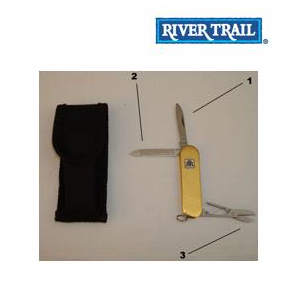 Accessories Pocket Knife 1 - 1-1/2" blade (1-1/4" cutting edge) 2 - 1-1/2" nail file 3 - scissors Key ring loop Gold colour finish Nylon pouch with belt loop