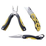 Includes three tools, multi-tool, folding knife with clip and utility knife Multi-tool features pliers and rubber grips Yellow and black colour
