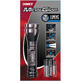 LED flashlight. 150 lumen. Aluminum body. Includes 3 AAA batteries and a battery power indicator.