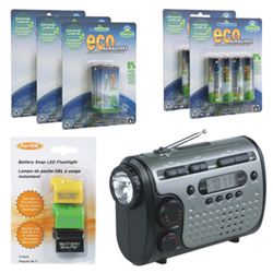 The Purtek Emergency Bundle has everything you need in a no power situation. An AM/FM radio with flashlight, alarm clock, dynamo charger, and siren. Includes 8 environmentally friendly eco alkaline AA batteries, and 3 handy snap LED lights tha... Read more