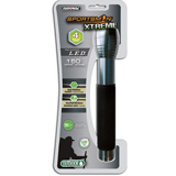 Sportsman Xtreme, black & silver, 4 W LED light. Machined aluminum, water-resistant, 120 lumens, 3 C batteries included, lifetime warranty.