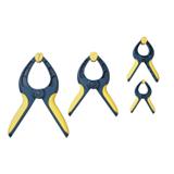 Includes: six ¾", four 1", two 2", two 3" clamps Ergonomic rubber grips for greater comfort Pivoting V-grooved jaws for flat or oddly-shaped work pieces High-strength plastic Lightweight and impact-resistant