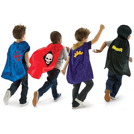 polyester-nylon includes 4 capes, each with its own distinctive look each is 23" long; expanding from 9" w. at top to 22" w. at bottom ages 3 to 6 years