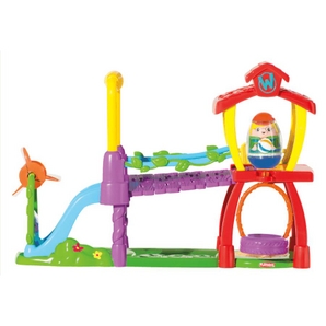 Girls Figures & Acc This school themed playground has child activated wobbly bridge, slide with spinner, tire swing, and lots of places for Weebles to play hide n seek Comes with 1 weebles figure Age 12 months +